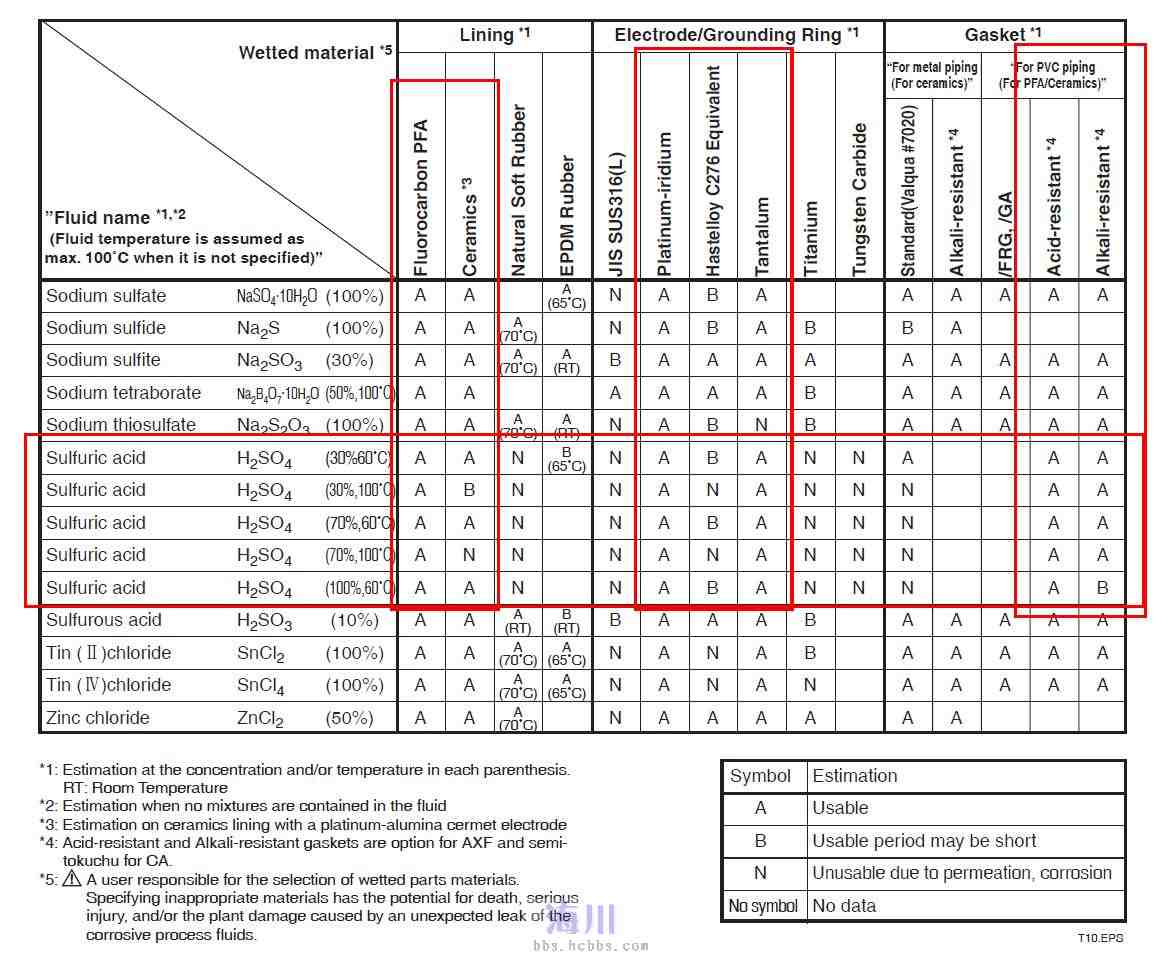 對于硫酸用電磁流量計的選型,可以參考下表數(shù)據(jù):