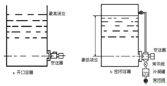 差壓式液位變送器安裝在最低液位的同一水平高度上。測量開口容器時(shí),儀表負(fù)壓室通大氣。測量密封容器時(shí)負(fù)壓室通容器上部,此時(shí)若負(fù)壓室保持干燥,則可不裝冷凝罐,若安裝冷凝罐應(yīng)定期將罐中的冷凝液排出;排液時(shí)應(yīng)將常開閥關(guān)閉,以免變送器承受單向壓力,見圖34。