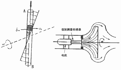 早期設(shè)計(jì)的科氏力質(zhì)量流量計(jì)的結(jié)構(gòu)如圖2所示。將在由流動(dòng)流體的管道送入一旋轉(zhuǎn)系統(tǒng)中,由安裝在轉(zhuǎn)軸上的扭矩傳感器,來(lái)完成質(zhì)量流量的測(cè)量。這種流量計(jì)只是在試驗(yàn)室中進(jìn)行了試制。