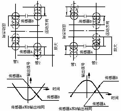 如圖23a,當(dāng)管子分開(kāi)時(shí),在振點(diǎn)前的流體中產(chǎn)生的科里奧利力與振動(dòng)力方向相反,減慢管子的運(yùn)動(dòng)速度;而在振點(diǎn)之后管中流體產(chǎn)生的科氏力與振動(dòng)方向相同,加快管子的運(yùn)動(dòng)速度。當(dāng)驅(qū)動(dòng)器使管子靠近時(shí),如圖23b,則產(chǎn)生相反的結(jié)果。在A、B兩點(diǎn)的傳感器可測(cè)的兩處管字運(yùn)動(dòng)的相位差,由此可得到流過(guò)測(cè)管中流體的質(zhì)量流量。