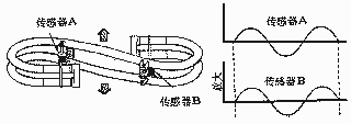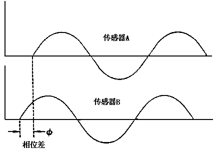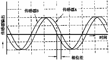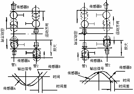 隨著振蕩運(yùn)動(dòng)的進(jìn)行,測(cè)量管被周期性地分開(kāi)、靠攏,科氏力也周期性地作用在兩根測(cè)量管上,通過(guò)安裝在測(cè)量管上的位移創(chuàng)按其A、B,測(cè)出由科氏力引起的測(cè)量管相對(duì)位置的變化,通常轉(zhuǎn)化為測(cè)兩點(diǎn)的相位差,如圖7所示。這個(gè)相位差的大小與質(zhì)量流量成正比。