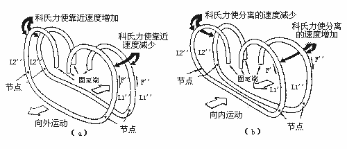 而回路中的流體在科氏力作用下示的回路L1'和L1''相互靠近的速度減慢,而另一端L2'和L2''兩回路相互靠近速度增加。