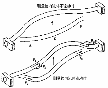 當(dāng)測(cè)量管中流體以速度V在管中流動(dòng)時(shí),由于受到C點(diǎn)振動(dòng)力的影響(此時(shí)的振動(dòng)力是向上的),流體質(zhì)點(diǎn)從A點(diǎn)運(yùn)動(dòng)到C點(diǎn)時(shí)被加速,質(zhì)點(diǎn)產(chǎn)生反作用力F1,使管子向上運(yùn)動(dòng)速度減慢;而在C點(diǎn)到B點(diǎn)之間,流體質(zhì)點(diǎn)被減速,使管子向上的運(yùn)動(dòng)速度加快。結(jié)果在C點(diǎn)兩邊的這兩個(gè)方向相反的力使管子產(chǎn)生一個(gè)變形,這個(gè)變形的相位差與測(cè)管中流體流過(guò)的質(zhì)量流量成正比。