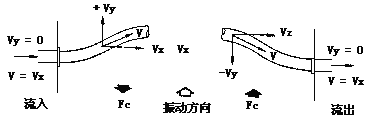當(dāng)流體質(zhì)點(diǎn)有進(jìn)口流入圖示振動(dòng)方向的測(cè)量管時(shí),流體質(zhì)點(diǎn)的垂直流動(dòng)速度為+Vy,同樣在流體質(zhì)點(diǎn)流向出口時(shí),其垂直流動(dòng)速度為-Vy。由此可以推出,流體質(zhì)點(diǎn)在通過(guò)振動(dòng)的測(cè)量管時(shí),垂直方向的速度是一個(gè)從零逐漸加大,直到中間最大,再逐漸減小到零的過(guò)程。由力學(xué)原理可知,速度的變化是由加速度引起的,而加速度是力作用于其上的結(jié)果。根據(jù)這個(gè)原理,稱這個(gè)垂直速度變化為科氏加速度Ac,因此作用于流體質(zhì)量M上的科氏力為Fc=Mac。在測(cè)量管上與中心距離相等的兩點(diǎn)上,作用的科氏力大小相等,方向相反。