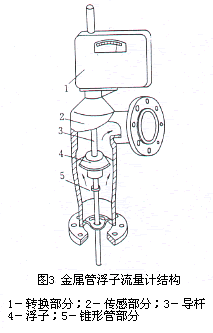| 圖3是直角型安裝方式金屬管浮子流量計典型結(jié)構(gòu),通常適用于口徑15-40mm以上儀表。錐管5和浮子4組成流量檢測元件。套管(圖3未表示)內(nèi)有導(dǎo)桿3的延伸部分,通過磁鋼耦合等方式,將浮子的位移傳給套管外的轉(zhuǎn)換部分。轉(zhuǎn)換部分有就地指示和遠傳信號輸出兩大類型。除直角安裝方式結(jié)構(gòu)外還有進出口中線與錐管同心的直通型結(jié)構(gòu),通常用于口徑小于10-15mm的儀表。 |
