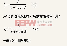 時(shí)差法 測(cè)量流體流量的原理如圖1所示。它利用聲波在流體中傳播時(shí)因流體流動(dòng)方向不同而傳播速度不同的特點(diǎn),測(cè)量它的順流傳播時(shí)間t1和逆流傳播時(shí)間t2的差值,從而計(jì)算流體流動(dòng)的速度和流量。