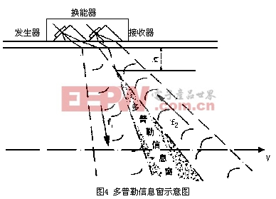 式(11)、(12)是按單個(gè)顆粒考慮時(shí),測(cè)得的流體流速和流量。但對(duì)于實(shí)際含有大量粒群的水流,則應(yīng)對(duì)所有頻移信號(hào)進(jìn)行統(tǒng)計(jì)處理。超聲波多普勒流量計(jì)的換能器通常采用收發(fā)一體結(jié)構(gòu),見圖4。換能器接收到的反射信號(hào)只能是發(fā)生器和接收器的兩個(gè)指向性波束重疊區(qū)域內(nèi)顆粒的反射波,這個(gè)重疊區(qū)域稱為多普勒信號(hào)的信息窗。換能器所收到的信號(hào)就是由信息窗中所有流動(dòng)懸浮顆粒的反射波的疊加,即信息窗內(nèi)多普勒頻移為反射波疊加的平均值。