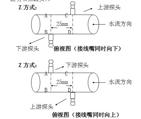 (1)在管路一面外側(cè)劃一長(zhǎng)十字為A點(diǎn),以十字為中心用盒尺向另一側(cè)量出1/2周長(zhǎng),即100mm,該點(diǎn)為B點(diǎn)。根據(jù)儀表菜單 2 5顯示安裝距離,例如安裝距離為25mm,從A點(diǎn)向一側(cè)量出25mm為C點(diǎn)和上面一樣從B點(diǎn)向另一側(cè)量出管路1/2周長(zhǎng)為D點(diǎn),B、D兩點(diǎn)連接,D點(diǎn)劃十字,A、D兩點(diǎn)即為兩個(gè)探頭安裝點(diǎn),B、C兩點(diǎn)也可為兩個(gè)探頭安裝點(diǎn),以現(xiàn)場(chǎng)情況而定。