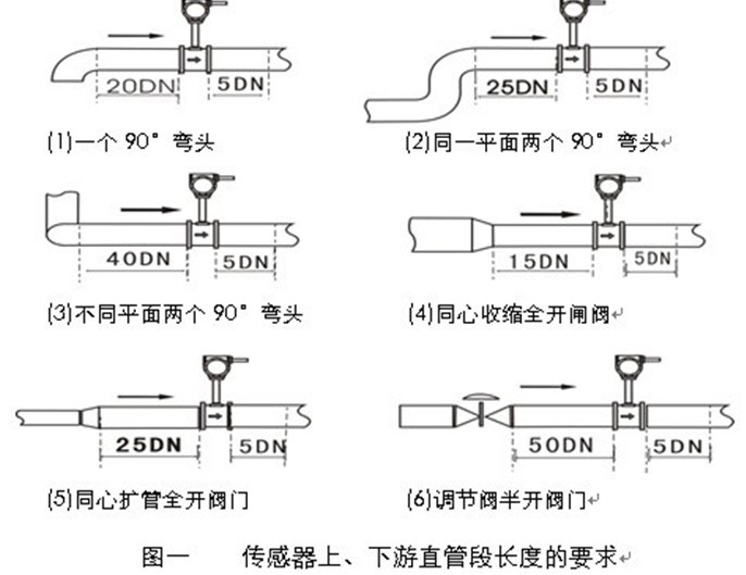 2、街流量傳感器的上游側(cè)和下游側(cè)應(yīng)有較長(zhǎng)的直管段。其上、下游直管段長(zhǎng)度根據(jù)管道狀況不同而不同,直管段的具體安裝長(zhǎng)度和要求見(jiàn)下圖。
