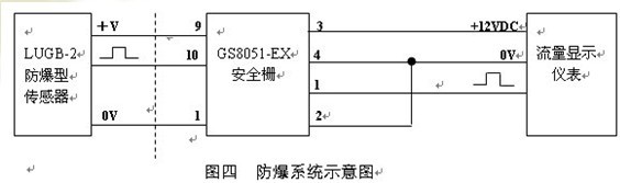 防爆型傳感器必須與合適的關(guān)聯(lián)設(shè)備——安全柵組成本質(zhì)安全型防爆系統(tǒng) (見(jiàn)下圖) ,通過(guò)電源信號(hào)安全柵再連接到流量顯示儀表上。