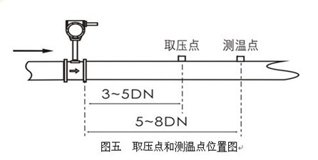 3、取壓點(diǎn)和測(cè)溫點(diǎn),應(yīng)分別在傳感器的下游3~5DN處和6~8DN處(見(jiàn)圖五)。