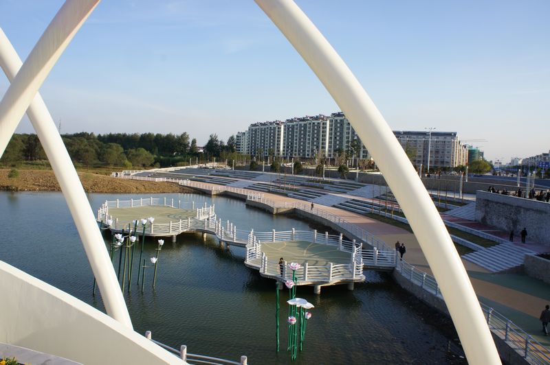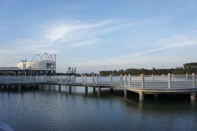 粉紅的荷花臺、景觀亭、樹陣道、浮水木棧、荷花荷葉雕塑、荷主題碑文……在淮安金湖縣三河灘邊,一座氣勢恢弘、祥和安謐的荷花廣場如出水芙蓉,盛開在柳樹灣濕地的懷抱。