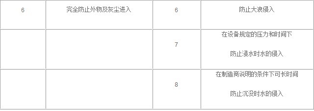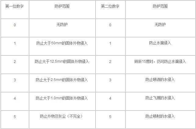平時所見的防護等級都用IP加兩位數字來表示,其中IP為防護等級的標示,第一位數字表示含義對應下表: