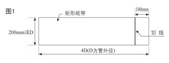 一、制作定位紙:取一條長4D(D為管徑),寬200mm(或D)的矩形紙帶(根據(jù)現(xiàn)場情況,可以用防濕、防腐蝕的材料代替紙帶),在距邊緣約100mm處劃一條線;(如圖1)