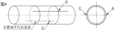 四、從A點開始,沿著定位紙邊緣量出管道1/2周長,該平行交叉點為C,在C點劃一條與管軸平行的直線(也就是與定位紙上的直線平行);(如圖4)