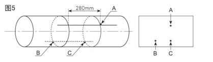 五、去掉定位紙,從點C開始,在所劃直線上量出安裝距離L,從而決定出B點。這樣A、B兩點為安裝位置;例如L=280mm (如圖5),將球閥底座分別焊接在A和B兩點上,注意球閥座中心點一定要分別與A和B兩點重合。