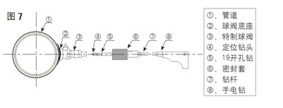 將開孔器密封護套與特制球閥外螺紋連接,擰緊后,打開球閥,推動鉆桿直至與管道外壁接觸,將手電鉆與鉆桿接好鎖緊,接孔板流量計通電源,開始鉆孔,在鉆孔過程中電鉆保持低速轉(zhuǎn)速不要過快、以免卡鉆,甚至鉆頭折斷,鉆透后,拔出鉆桿直到開孔器鉆頭的最前端退至球閥芯后,關(guān)上球閥,卸下開孔器。