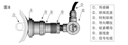 把鎖緊螺母旋至傳感器底部,將傳感器旋入特制球閥導(dǎo)向螺紋,當(dāng)旋至球閥芯時,打開球閥,繼續(xù)旋入傳感器,直至傳感器前蒸汽流量計端伸出管道內(nèi)壁,調(diào)整好傳感器的角度,(兩個傳感器進線孔應(yīng)同時向上或向下),緊固好鎖緊螺母,最后將線接好,用硅橡膠密封接線處。