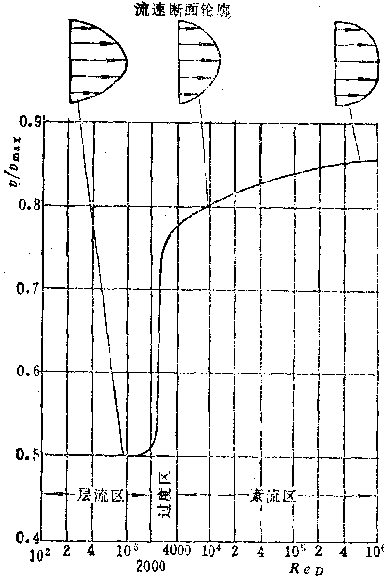 雷諾數(shù)小,意味著流體流動時各質點間的粘性力占主要地位,流體各質點平行于管路內壁有規(guī)則地流動,呈層流流動狀態(tài)。雷諾數(shù)大,意味著慣性力占主要地位,流體呈紊流流動狀態(tài),一般管道雷諾數(shù)Re<2000為層流狀態(tài),Re>4000為紊流狀態(tài),Re=2000~4000為過渡狀態(tài)。在不同的流動狀態(tài)下,流體的運動規(guī)律.流速的分布等都是不同的,因而管道內流體的平均流速υ與最大流速υmax的比值也是不同的。因此雷諾數(shù)的大小決定了粘性流體的流動特性。下圖表示光滑管道的雷諾數(shù)ReD與速度比V/Vmax的關系。