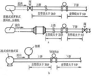 如果是使用活塞式或羅茨式的鼓風(fēng)壓縮機氣體管道或柱塞式泵的高壓液體管道(約1MPa),流體容易發(fā)生振動,此時,應(yīng)把閥門安裝在流量計上游,最好是在流量計上游裝一個液體減振器;同時應(yīng)考慮在流量計上游安裝儲罐以減少流體振動(見圖2)。